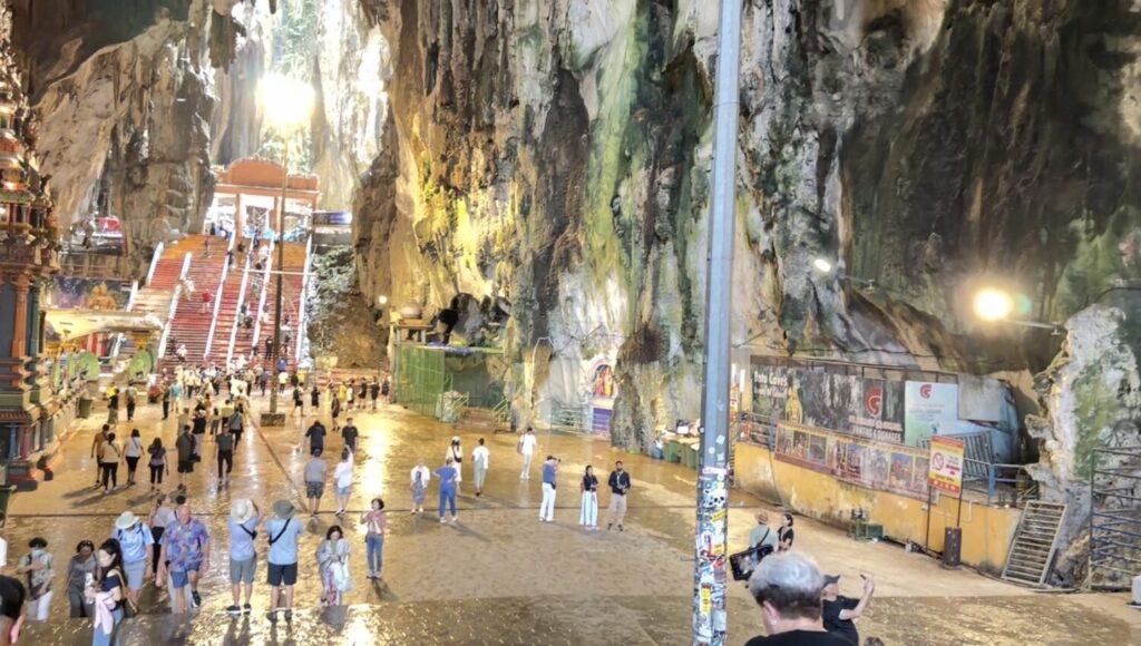 最初に訪れたバトゥ洞窟は、ヒンドゥー教の聖地として知られる寺院です。入口には高さ約43メートルの巨大なムルガン神像がありますが、現在工事中のため目にすることはできませんでした。その背後には、272段のカラフルな階段が続いてます。階段を登るのは大変でしたが、頂上に広がる鍾乳洞と寺院の荘厳な雰囲気は圧巻で、自然と信仰が調和した独特の空間に強い感動を覚えました。