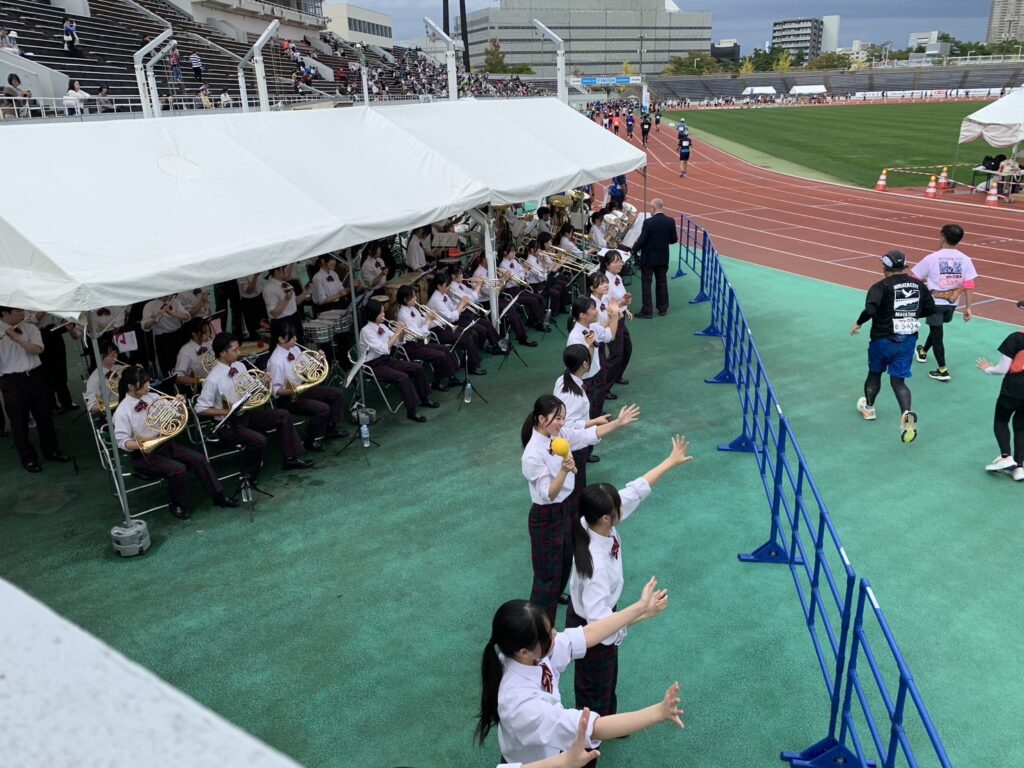 午後は、新潟市陸上競技場へ移動して、 入場口付近でフルマラソンでゴールするランナーの皆様に向けて、元気の出る明るい曲を演奏致しました。ランナーの皆さんが、演奏に合わせて手を振っていただくなど、とても充実した演奏となりました。